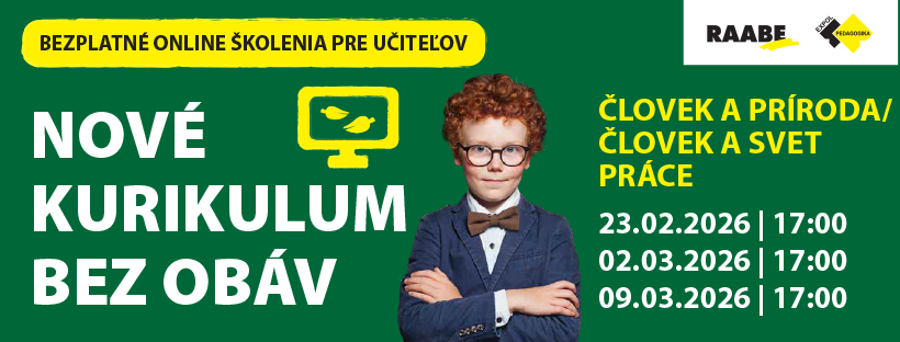 Aj vy máte obavy z prechodu na nové kurikulum? Uvažujete ako teóriu premietnete do praxe? Hľadáte pomôcky a postupy, ktoré vám to uľahčia? Nechce sa vám cestovať a radšej sa vzdelávate z pohodlia domova? Prihláste sa na online školenia a získate istotu aj jasné odpovede na všetky vaše otázky ohľadom nového kurikula. RAABE a EXPOL štartujú sériu online školení s názvom NOVÉ KURIKULUM BEZ OBÁV.