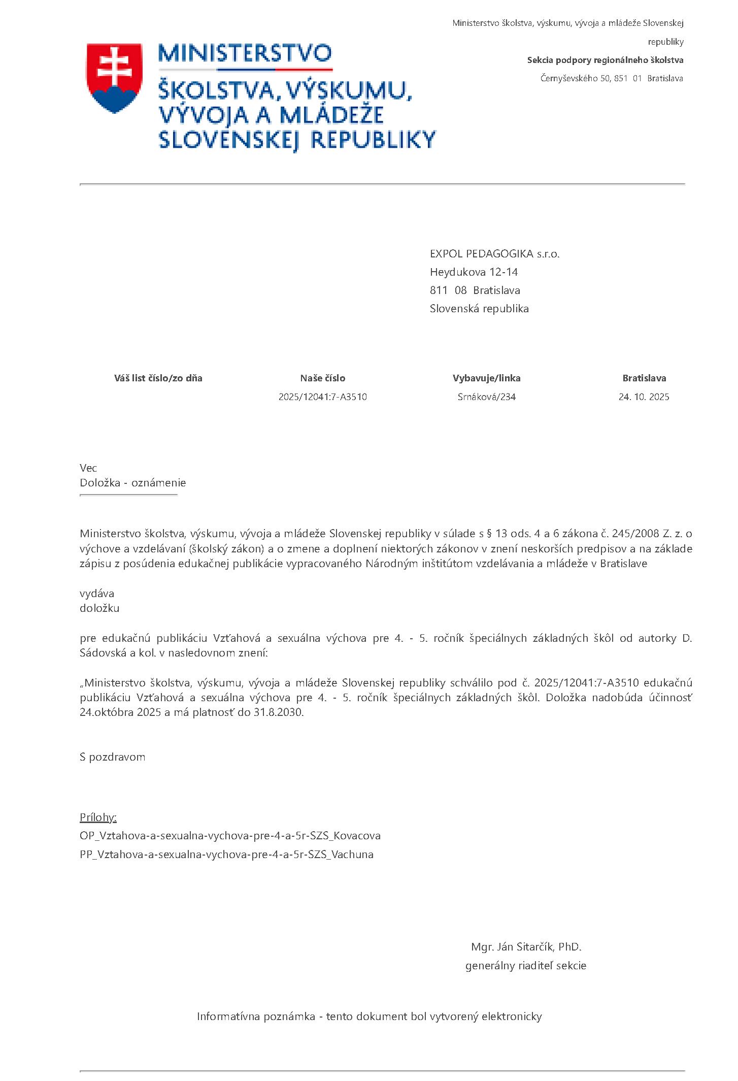 - podporuje žiakov vo vyjadrovaní svojich citov, prináša prvky prosociálneho správania, hodnoty priateľstva, vzájomnosti a rodiny...
