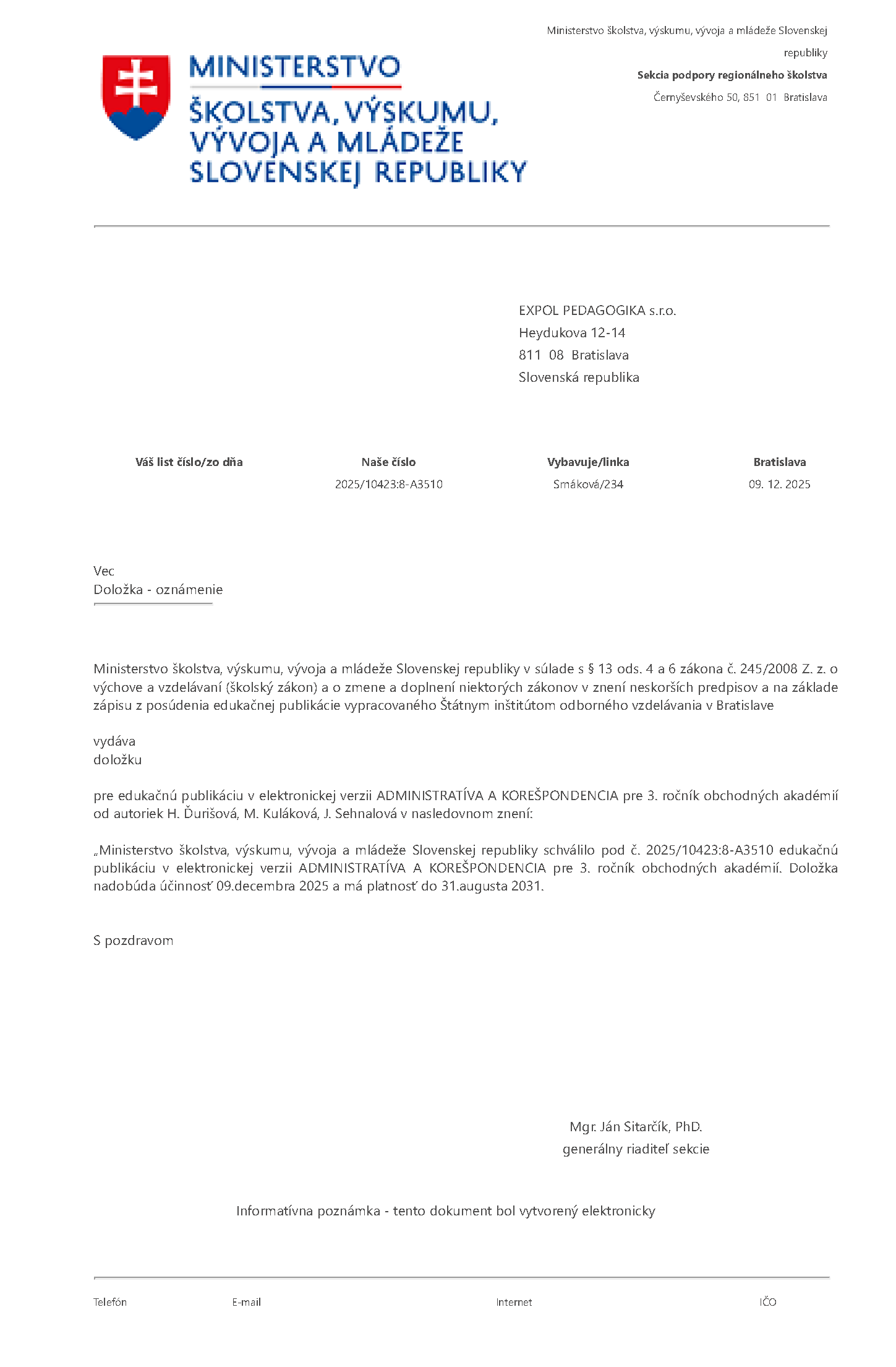 - Klasickú tlačenú učebnicu Administratíva a korešpondencia pre 3. ročník obchodných akadémií