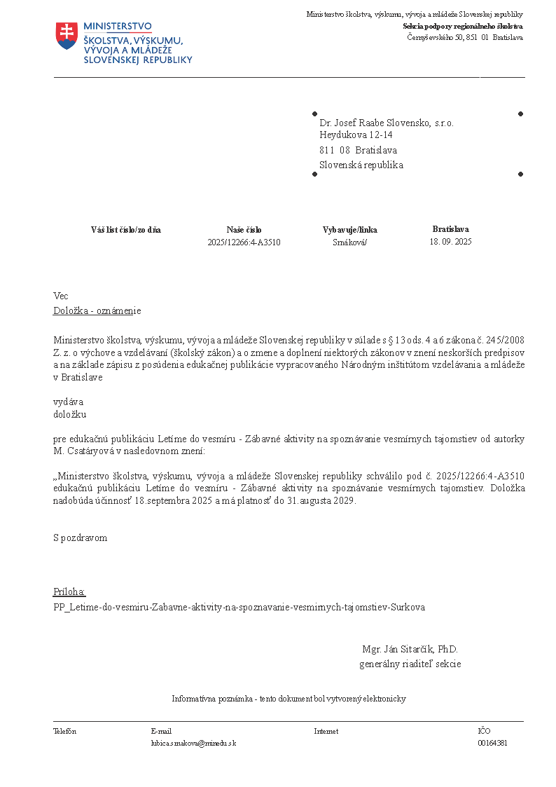 Svojím obsahom sa pracovný zošit opiera o štandardy, ktoré hovoria, čo by malo dieťa materskej školy a žiak prvého stupňa základnej školy o vesmíre vedieť.